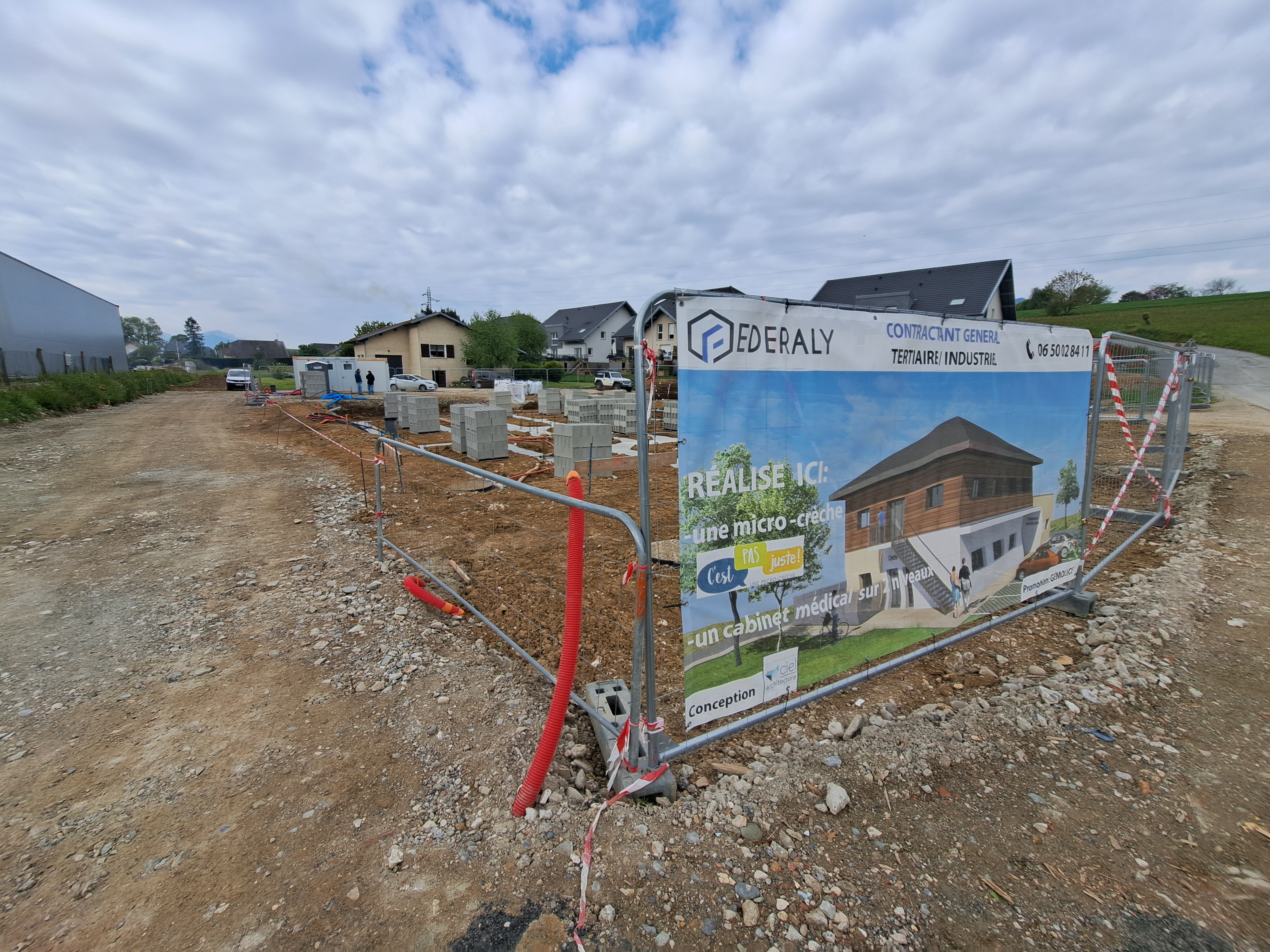 Federaly Tertiaire/Industriel a commencé les travaux de la maison médicale et de la crèche sur la commune de Mouxy (73). Malgré une météo capricieuse et un mois de Mai propice aux week-end prolongés, les installations de chantier sont en place. Les structures primaires de voirie et les réseaux enterrés sont réalisés, les fondations du vide sanitaire sont coulées, place aux élévations.
